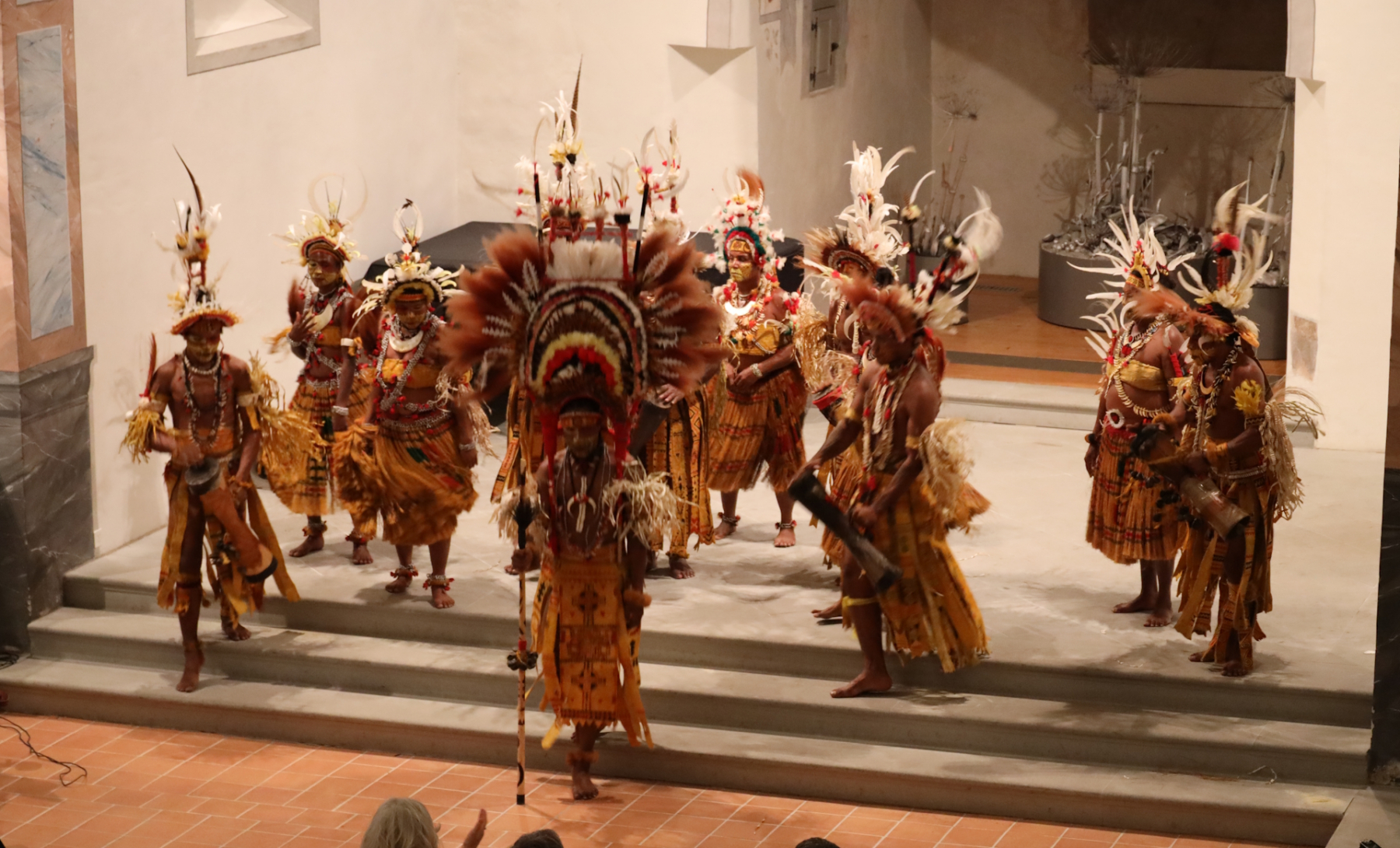 Après une description détaillée de leur costume (plumes de perroquet, d’aigle, de cacatoès à huppe jaune, de martin-pêcheur, et d’oiseau du paradis), les Papous ont dansé, mais ce n’était pas un show. Peu de sourires, mais des visages plutôt graves et sérieux pour danser les rituels et les cérémonies qui occupent une place centrale dans leur vie. Un moment fort de la soirée.