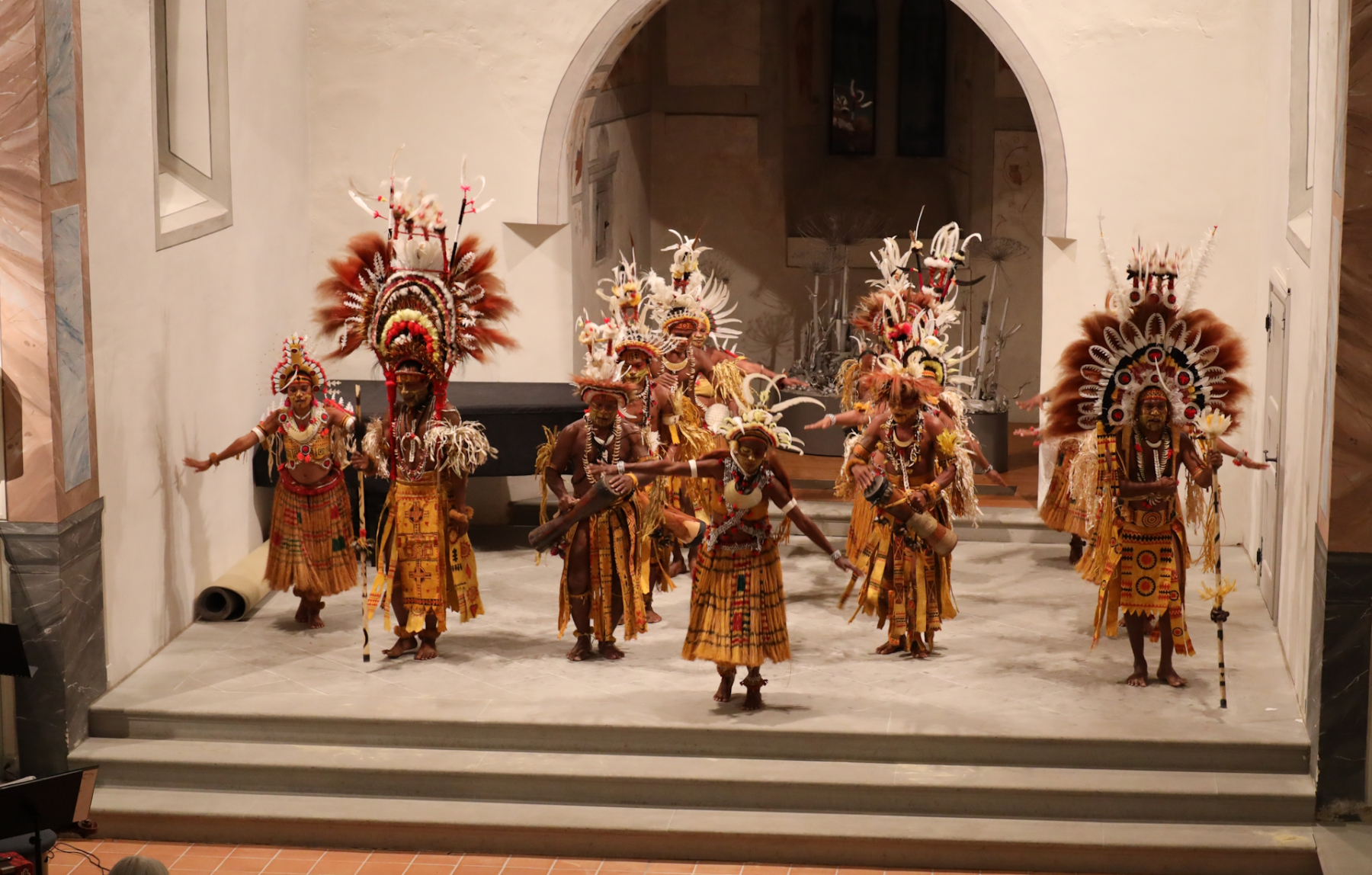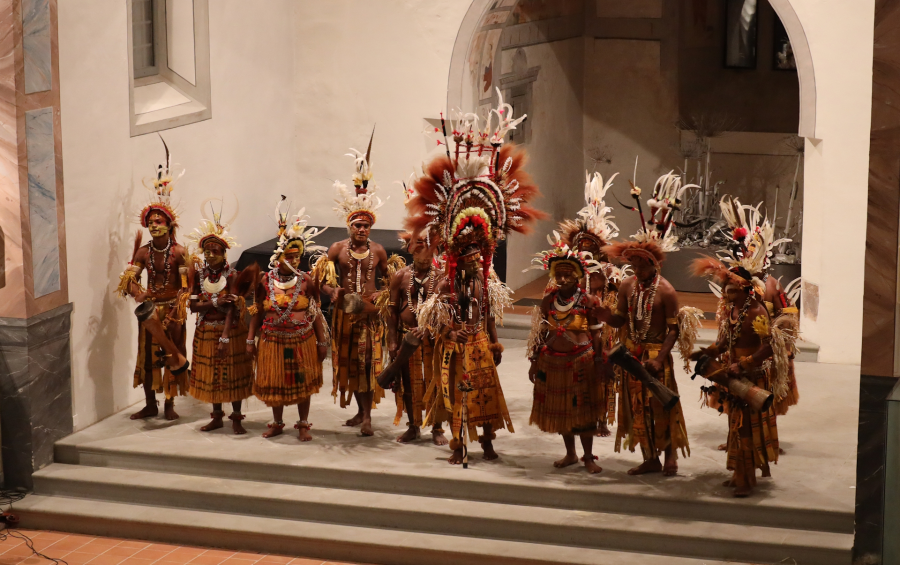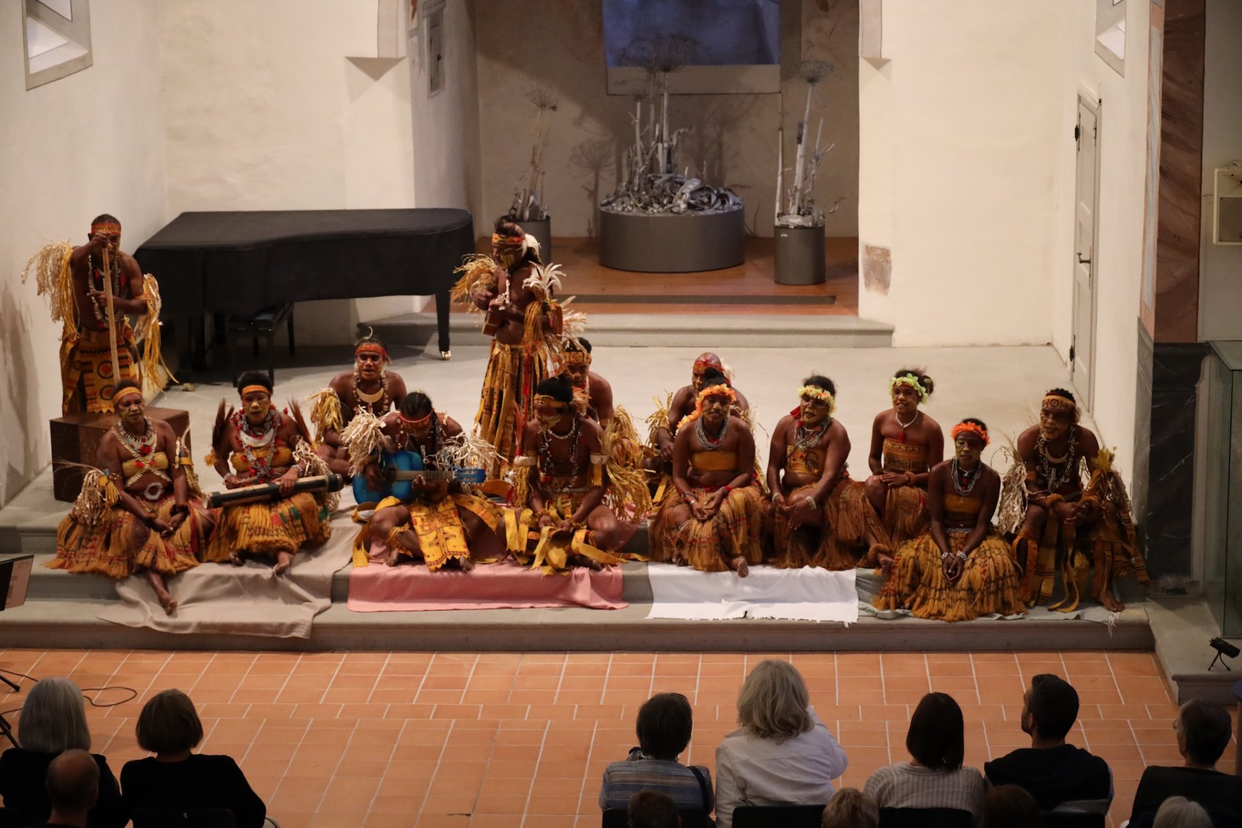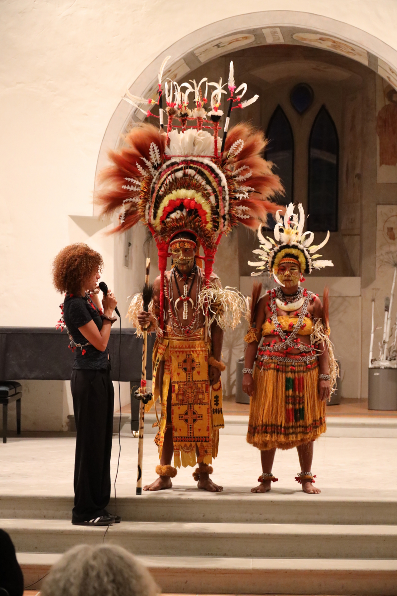 Après une description détaillée de leur costume (plumes de perroquet, d’aigle, de cacatoès à huppe jaune, de martin-pêcheur, et d’oiseau du paradis), les Papous ont dansé, mais ce n’était pas un show. Peu de sourires, mais des visages plutôt graves et sérieux pour danser les rituels et les cérémonies qui occupent une place centrale dans leur vie. Un moment fort de la soirée.
