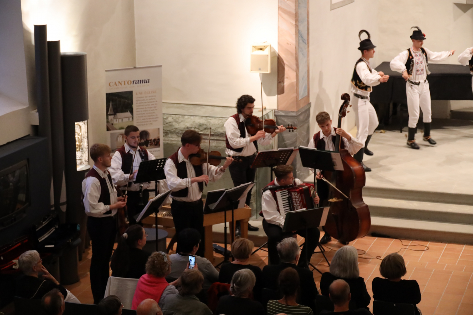 Enfin, les musiciens de l’orchestre slovaque, formé de violons, d’une clarinette, d’un accordéon, d’une contrebasse et d’un cymbalum, ont fait preuve de virtuosité et ont séduit les auditeurs. Ils ont aussi chanté, ils ont accompagné le groupe de cinq chanteuses à la voix puissante. Pour terminer, les dan-seuses et les danseurs sont revenus sur scène pour un final complet : musique, chant et danse.