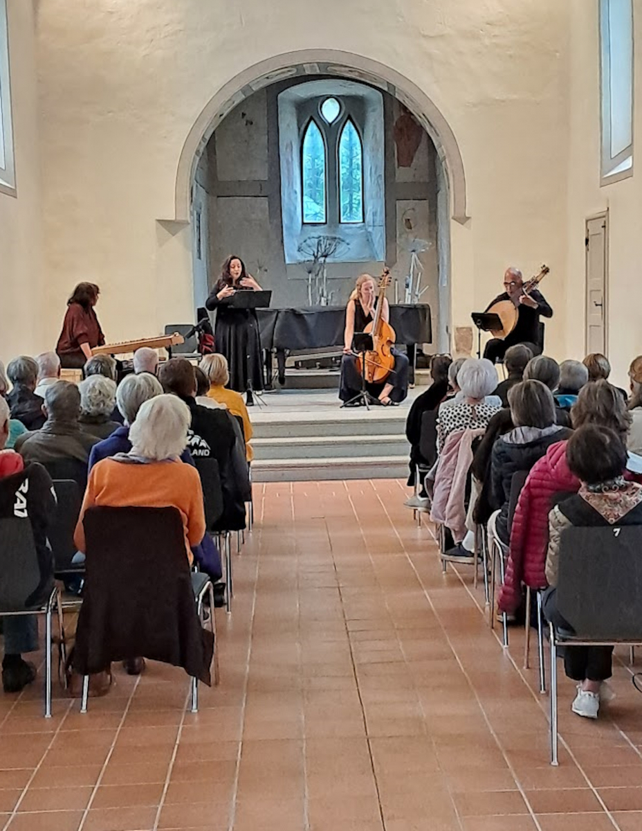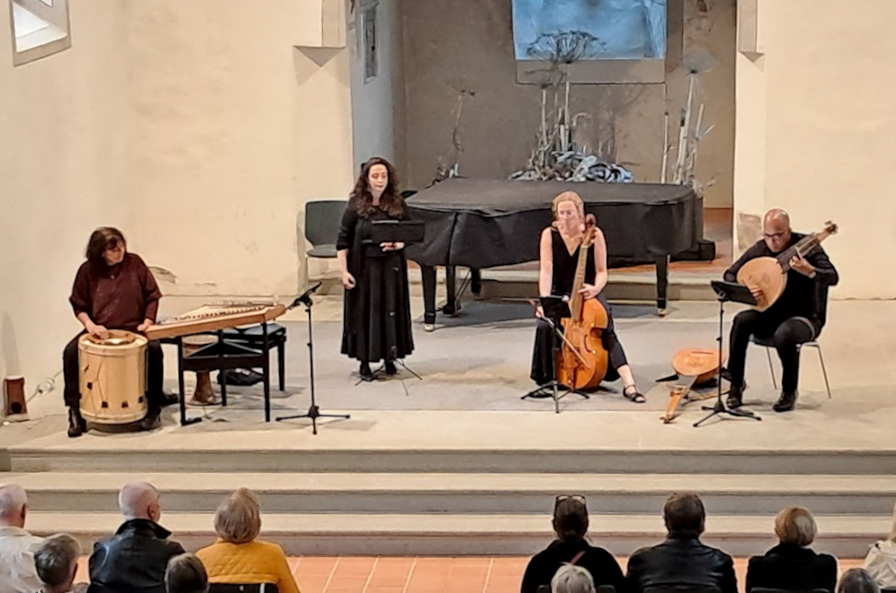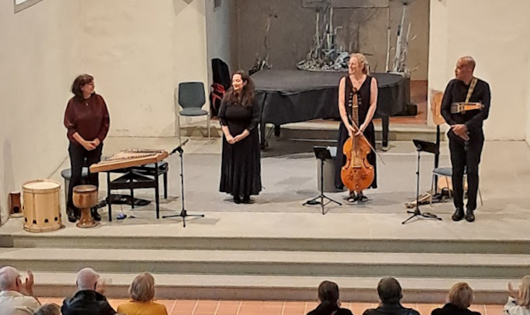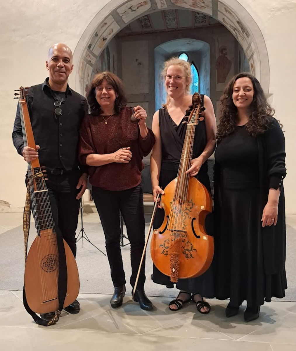 La soprano Rhaissa Cerqueira a rapidement conquis le public. D’abord en présentant d’une voix claire et agréable chaque pièce en français, puis, en chantant de manière émouvante les différentes facettes de l’amour. Pascale Clément et sa viole de gambe ont toujours été présentes, discrètement, mais avec virtuosité, tandis que l’accompagnement de Daniel de Morais au théorbe a apporté une base solide et chaleureuse à l’ensemble. Enfin, Michèle Claude, psaltérion et percussions, a complété le tout par des rythmes variés et quelques notes d’humour.